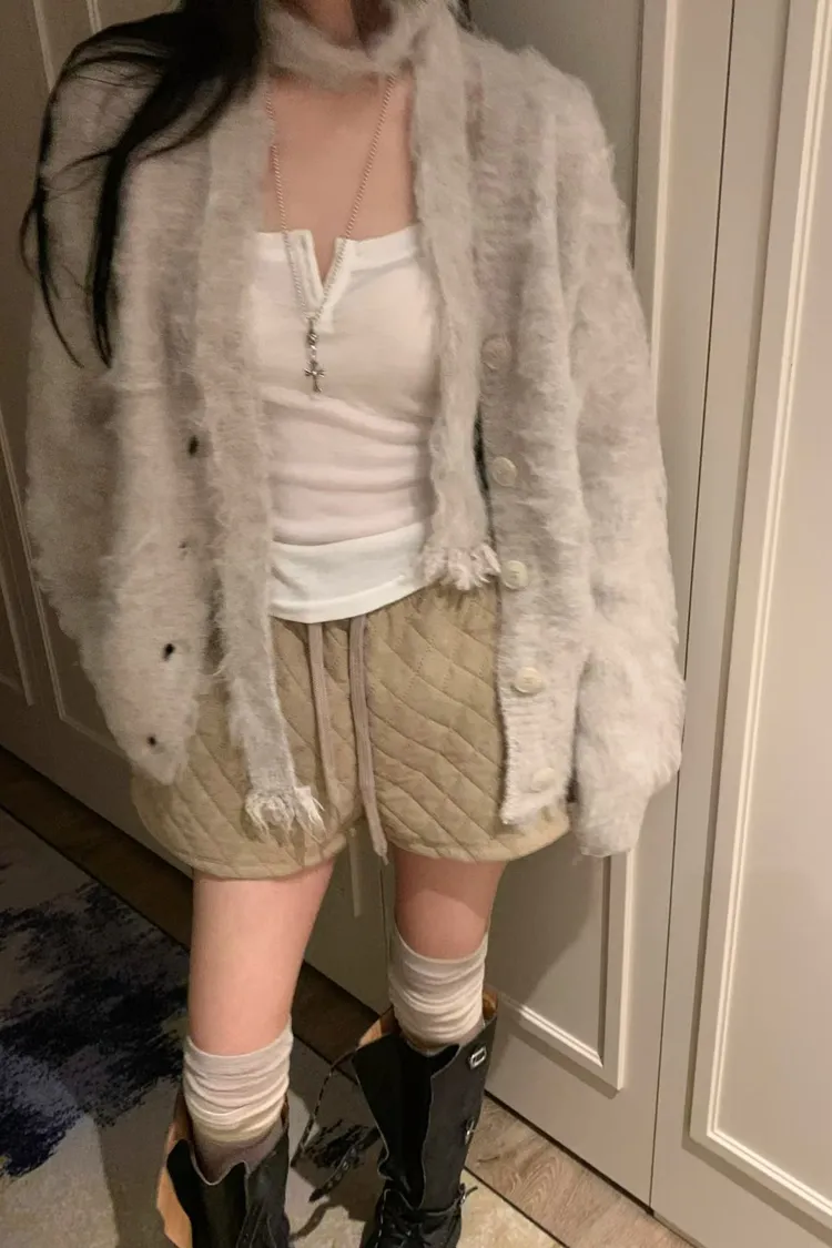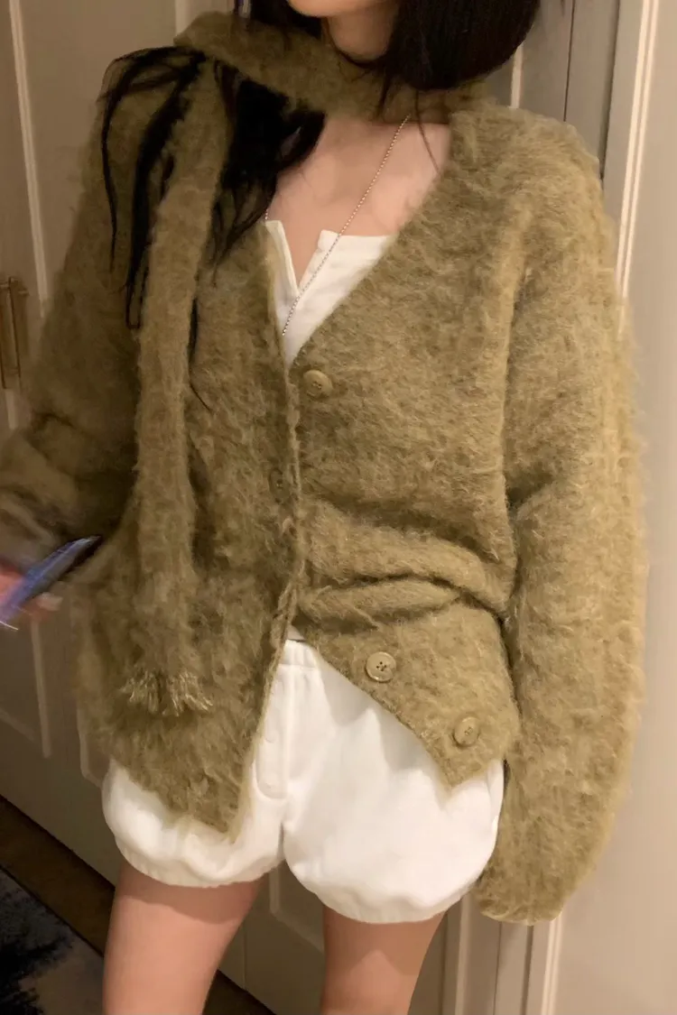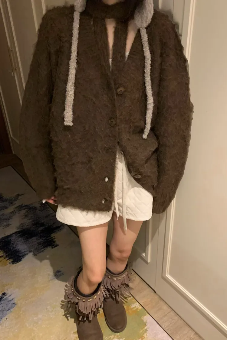 毛感鈕釦外套加圍巾