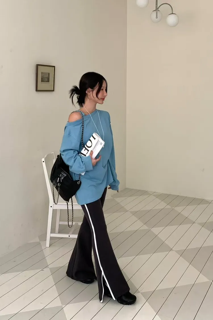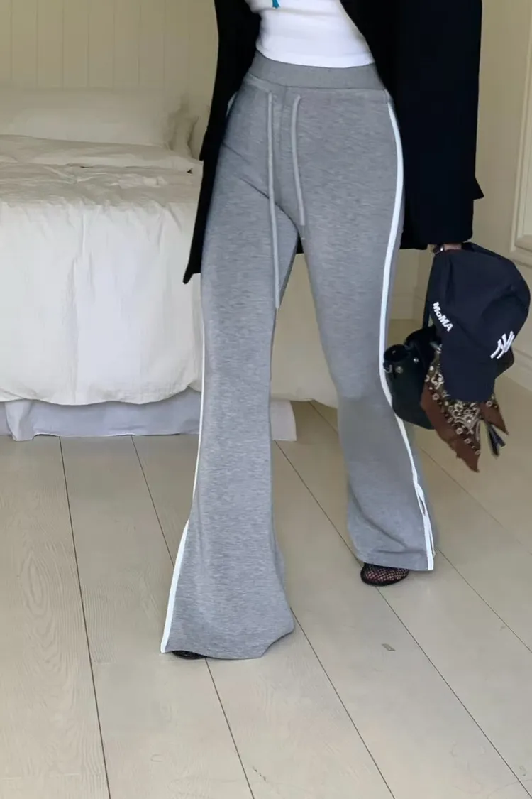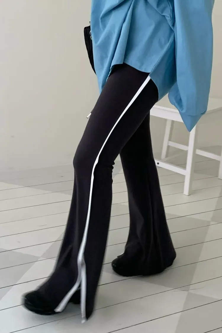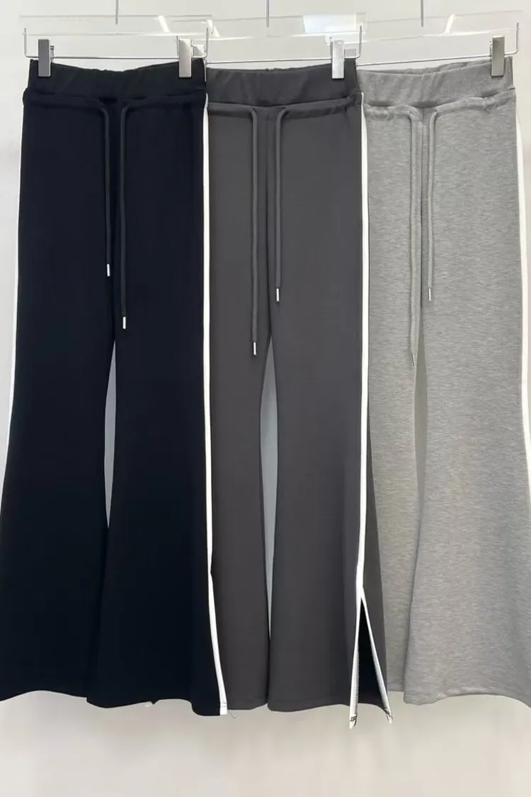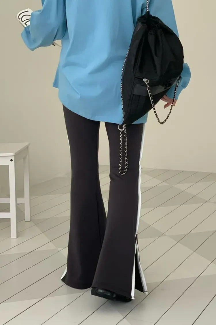 側邊帶線條下擺有開衩的棉長褲