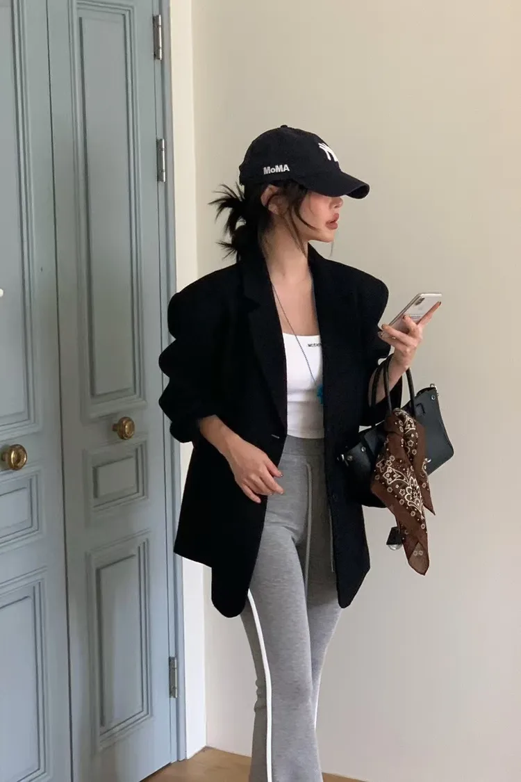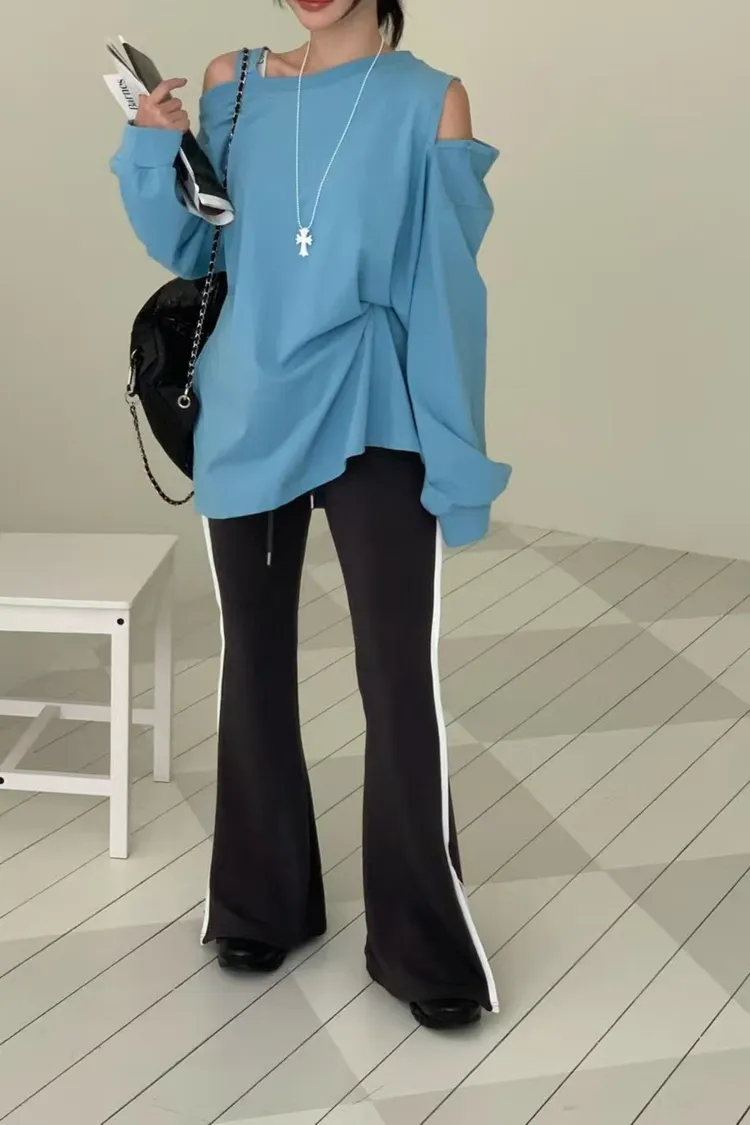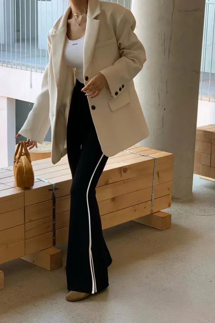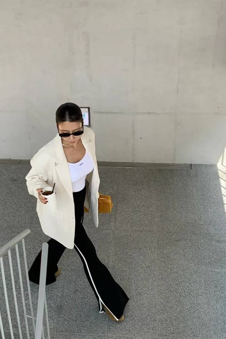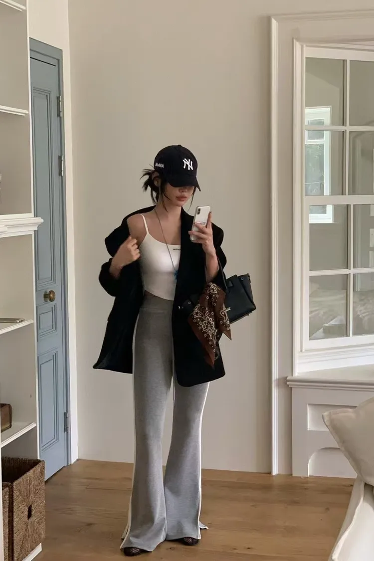 側邊帶線條下擺有開衩的棉長褲