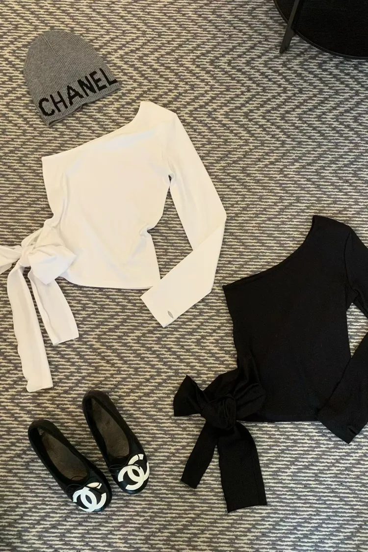 單肩長袖綁腰設計上衣