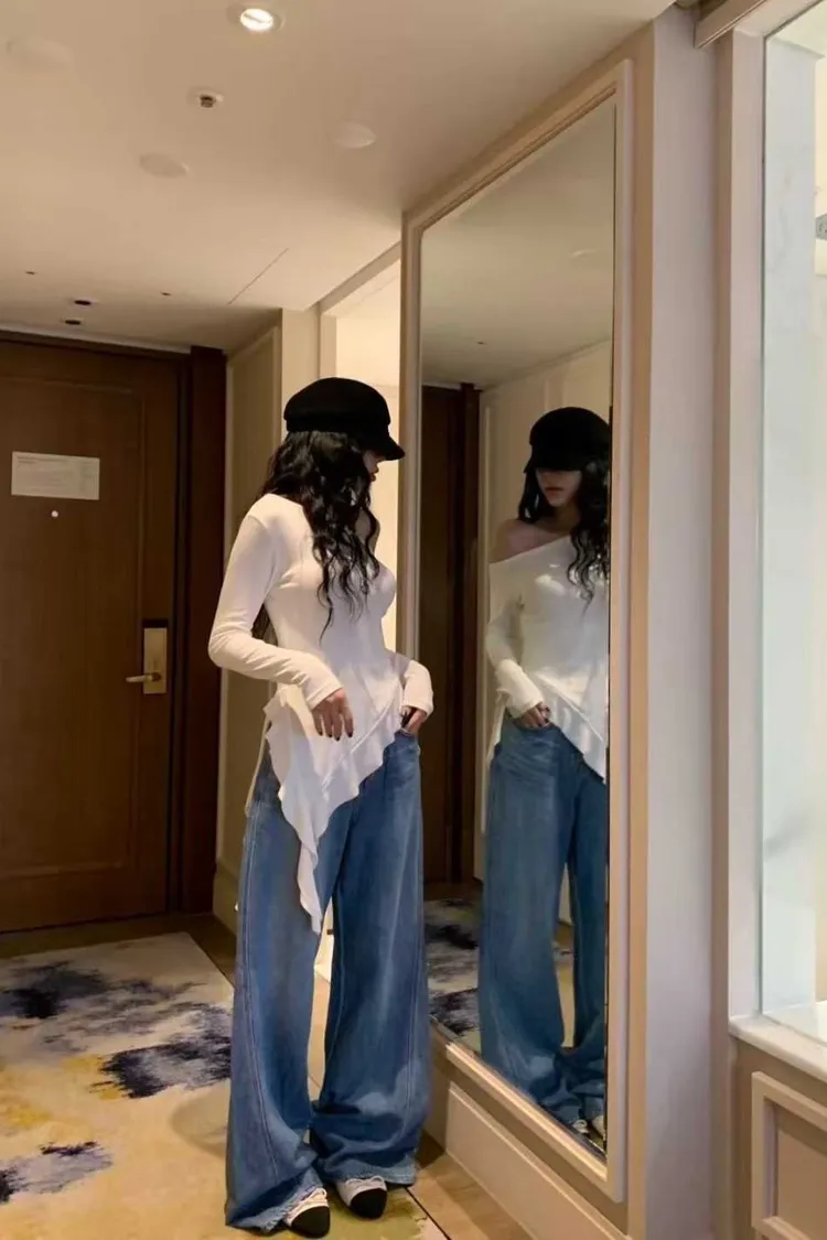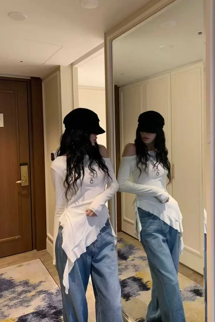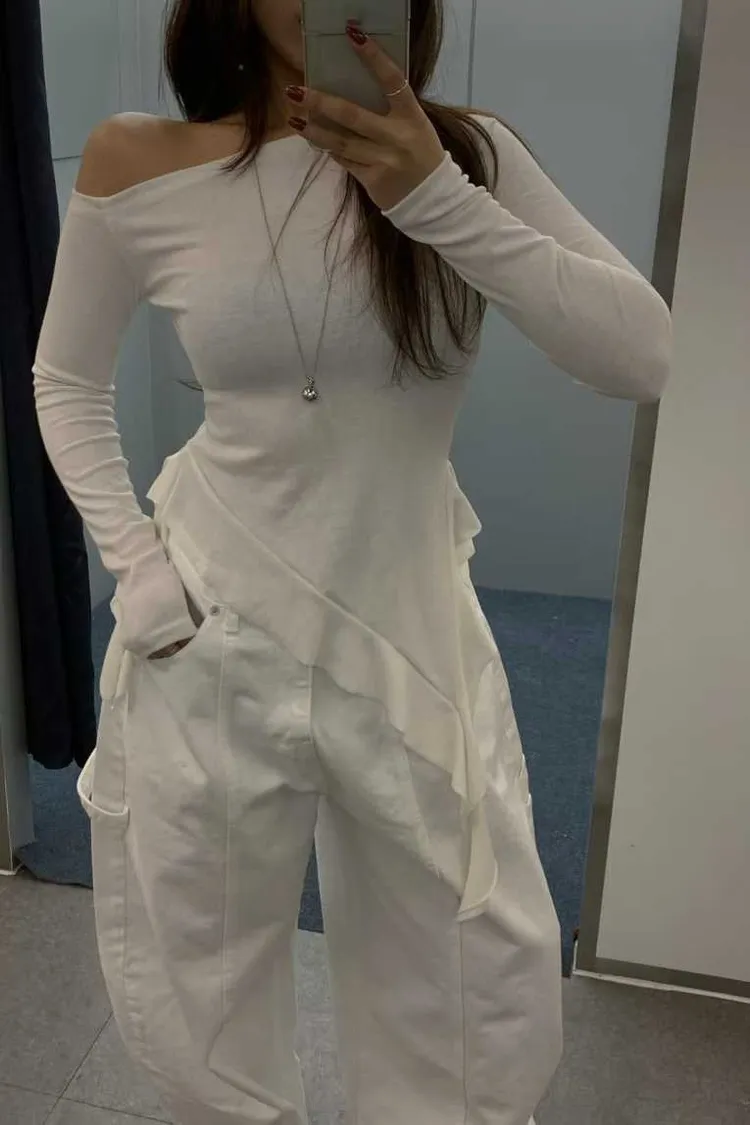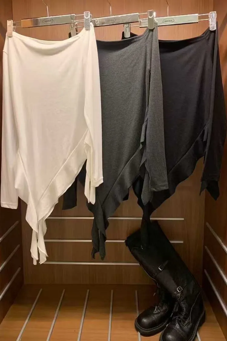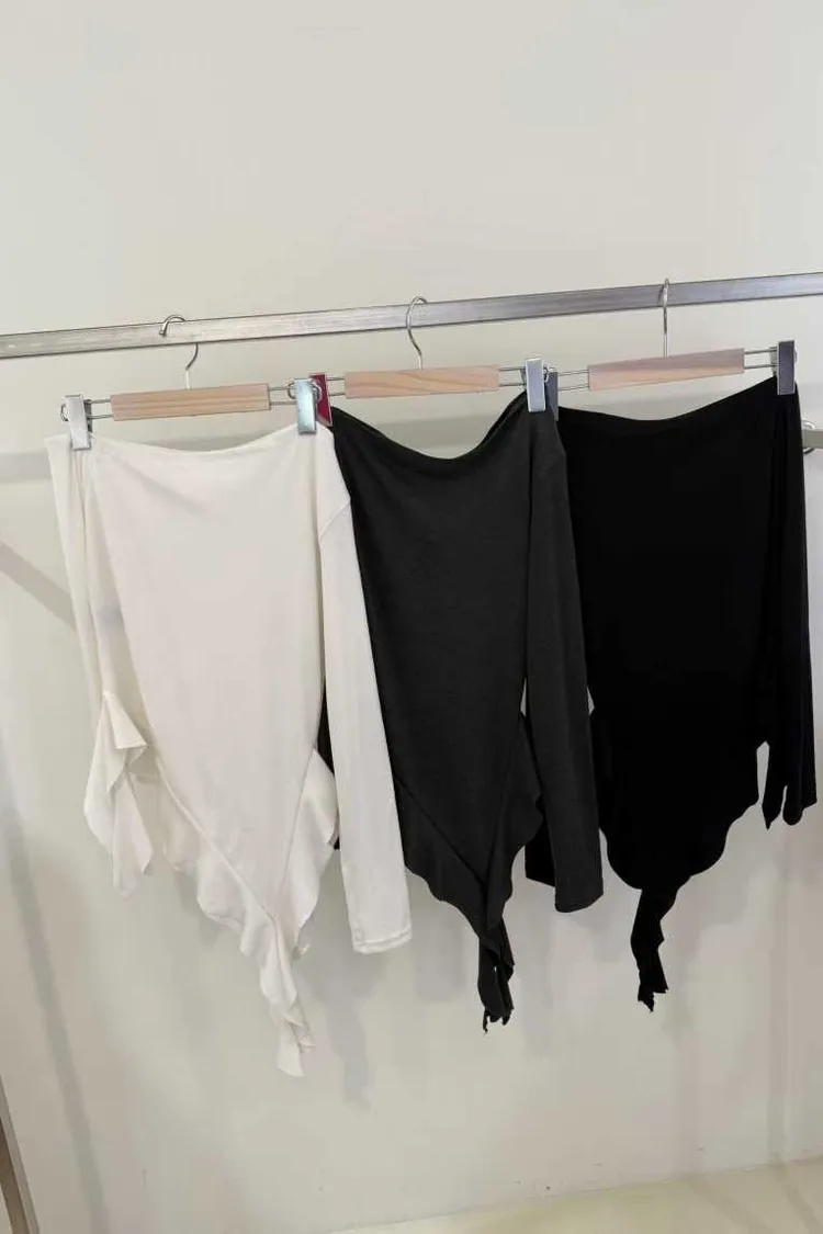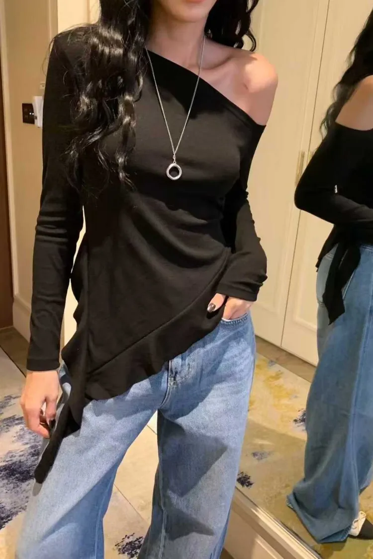 斜肩設計+不規則下擺上衣