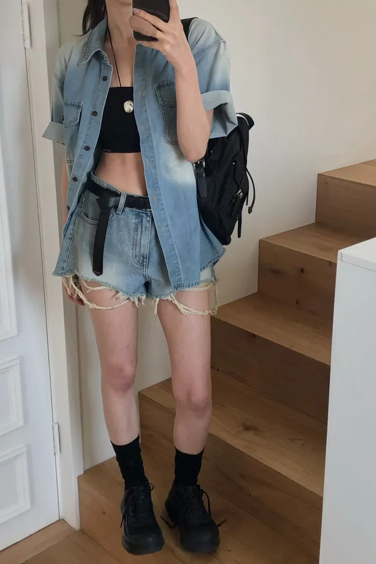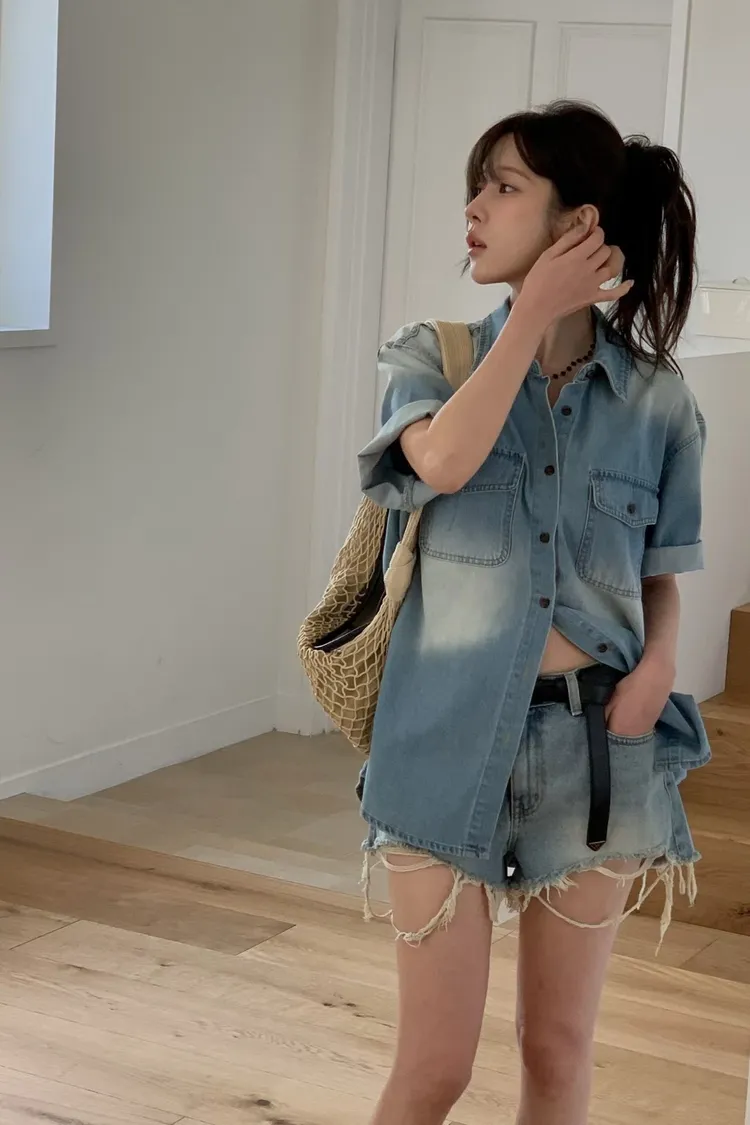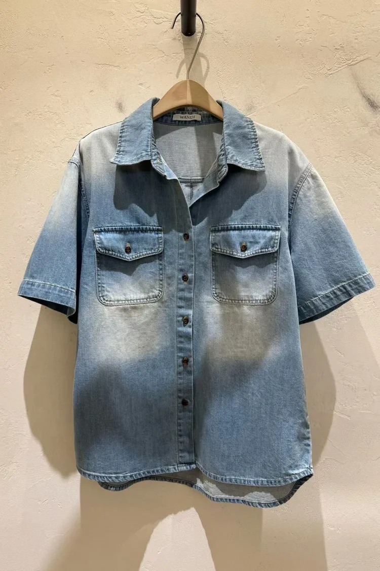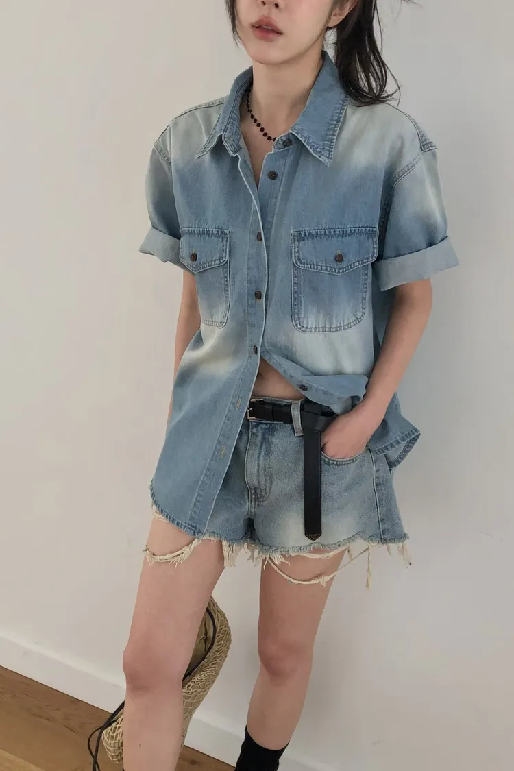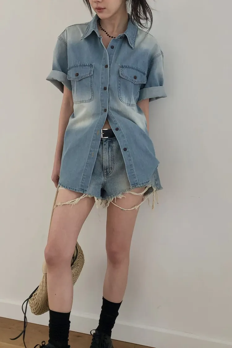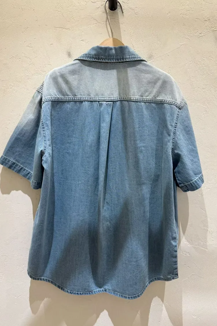 刷白雙口袋牛仔短袖外套(棉100%)
